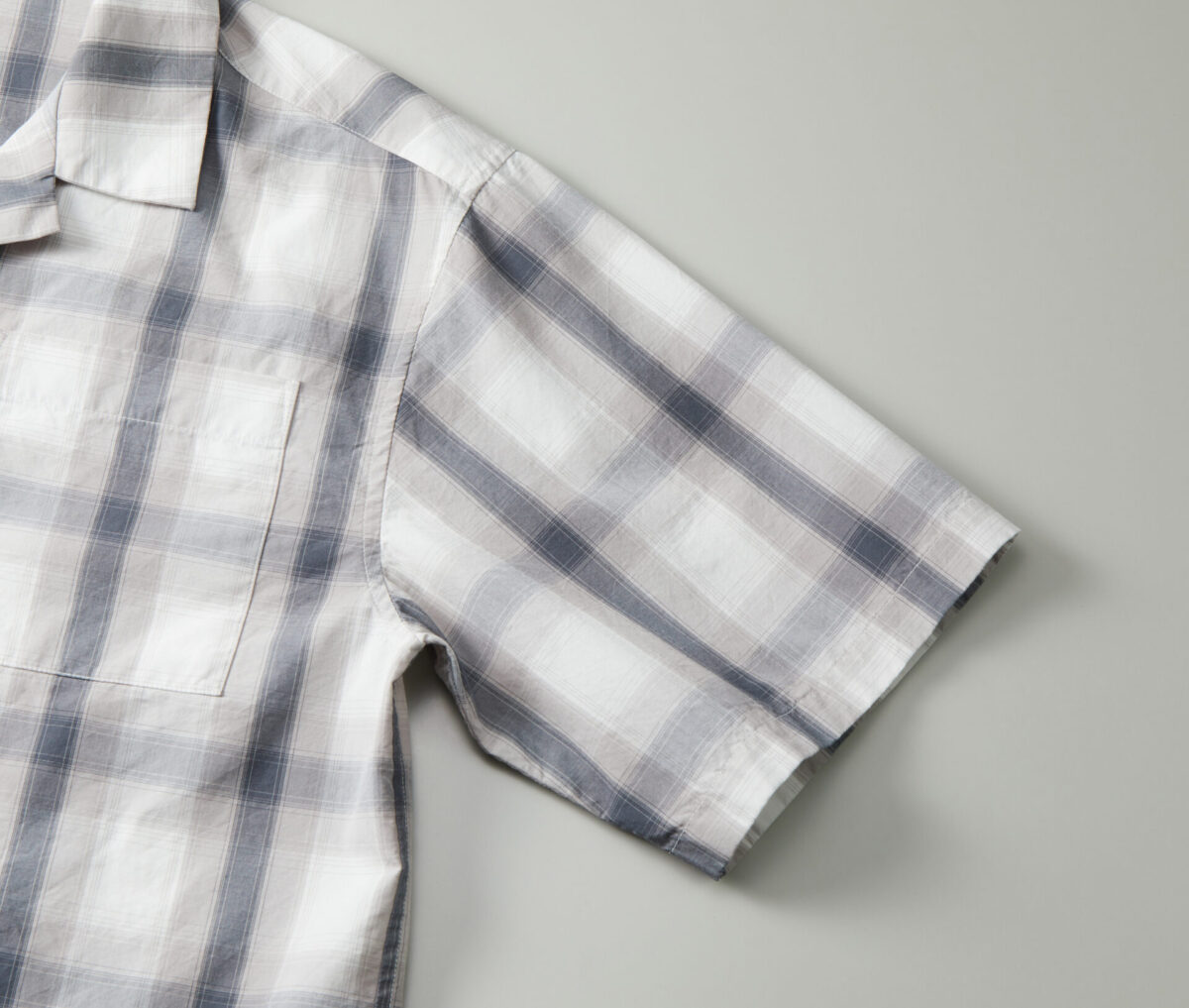 製品洗いを施すことで生地のハリ感をほどよく抑え、やわらかな風合いの仕上がり、開放感のあるオープンカラーが、自然な抜け感を演出