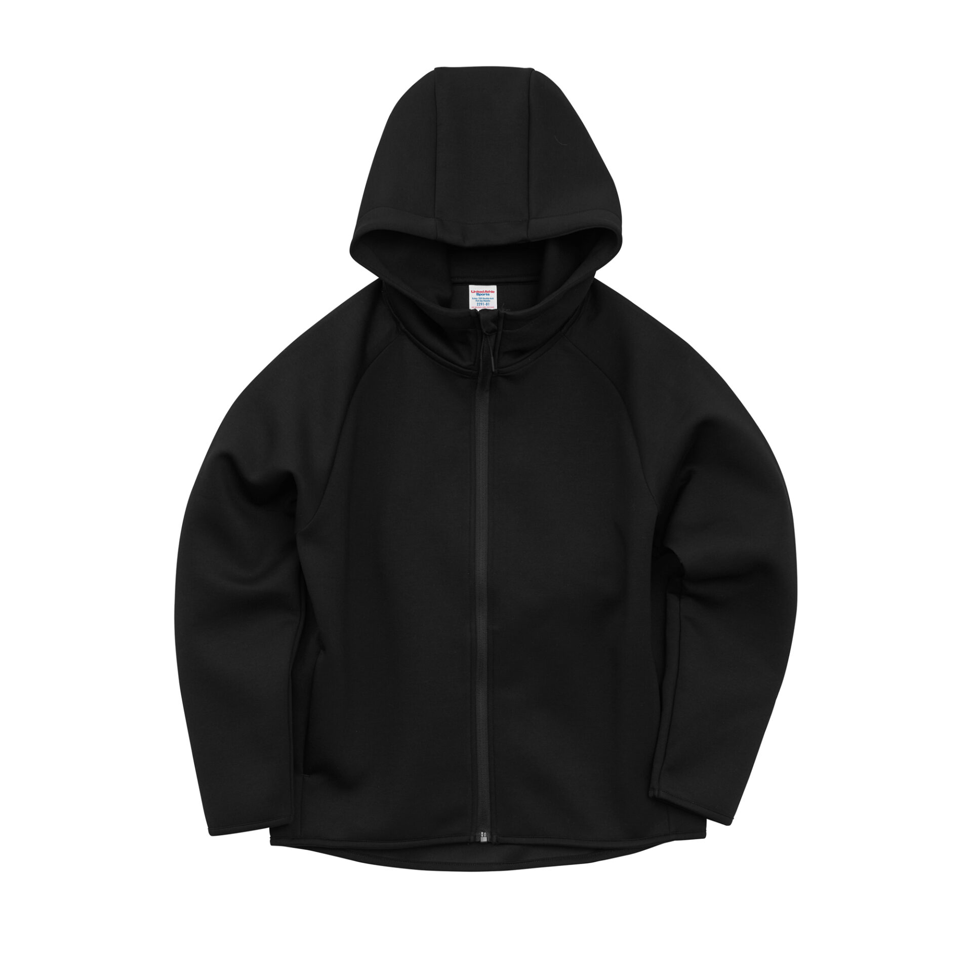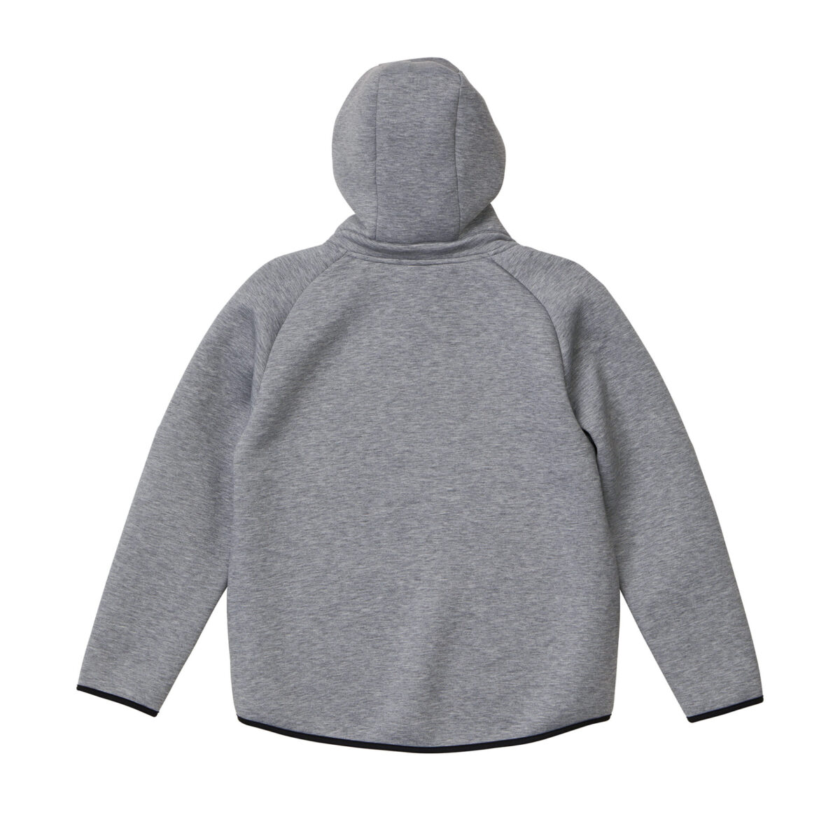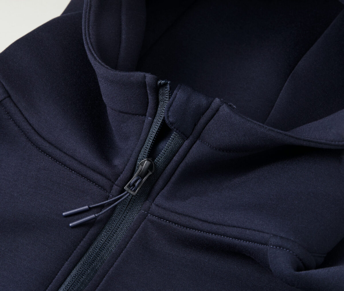 引き手付きでさっと開閉できるファスナーやチンガード、フードの立体感をアシストするハイネック仕様や後ろ台襟など、工夫も満載