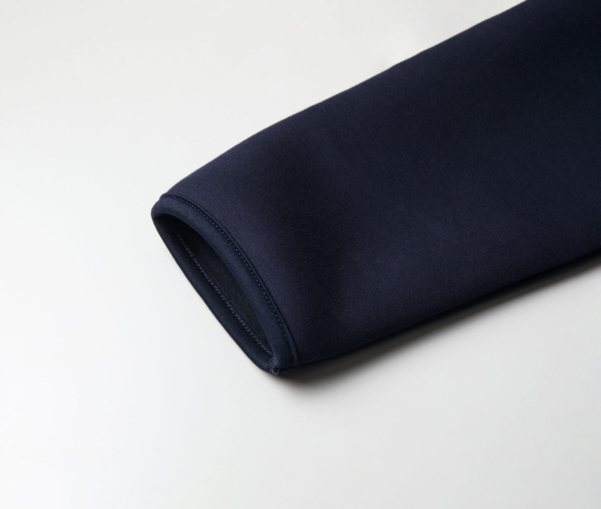 2枚の生地を中糸でつなぎ合わせており、空気の層ができることにより保温性にすぐれ、軽くてシワになりにくく、ストレッチ性も兼ね備えています