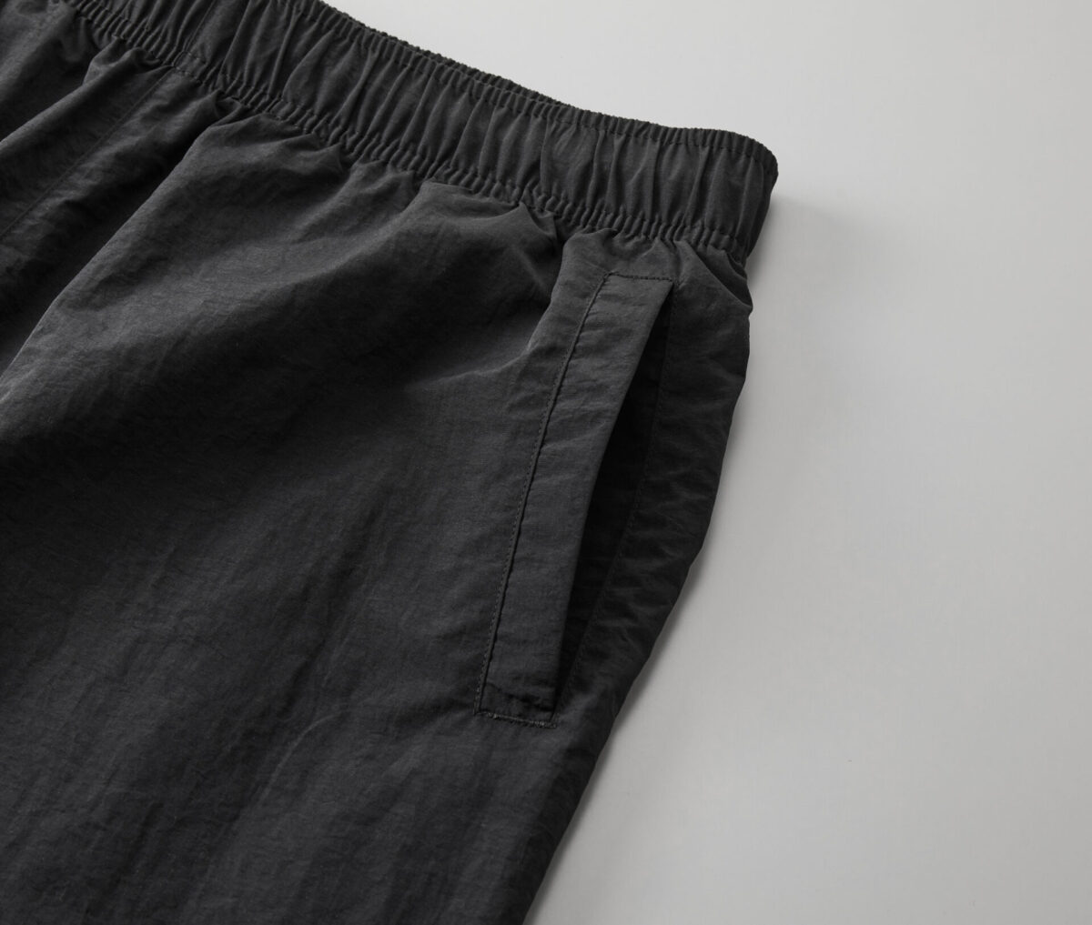タフなナイロンをコットンのように加工して織り込んだ、やわらかな生地が魅力のトレーニングパンツ
