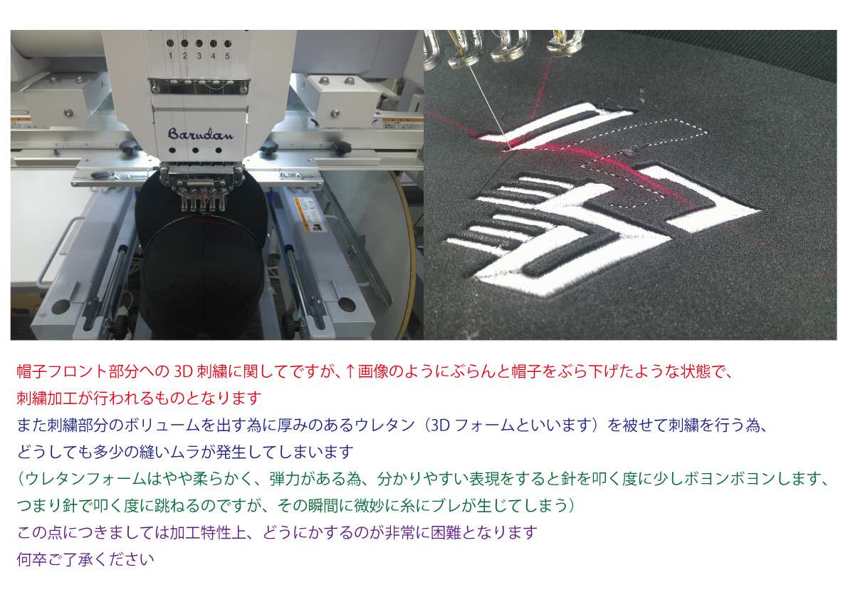 | 3D刺繍の場合、単価¥330円~増 ※デザインによっては3D刺繍ができない、適さない場合がございます 判別につきましてはお問い合わせください | |