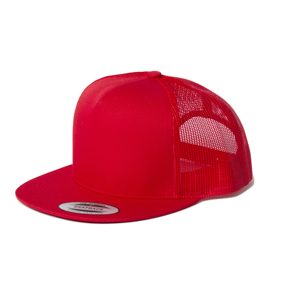フレックスフィットの5パネルフラットバイザーメッシュキャップ
