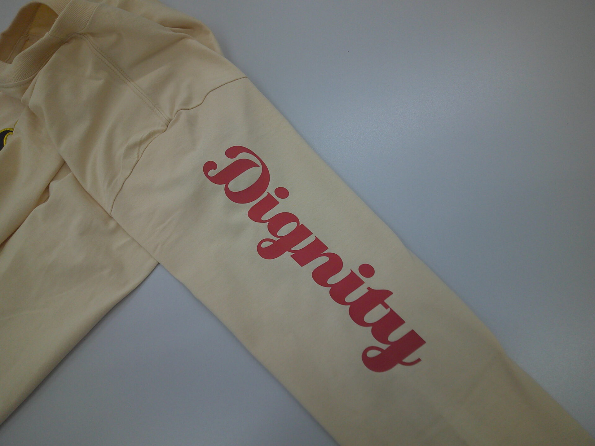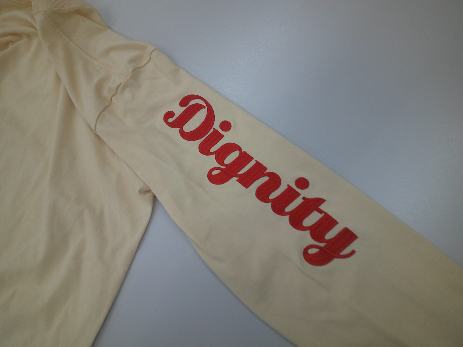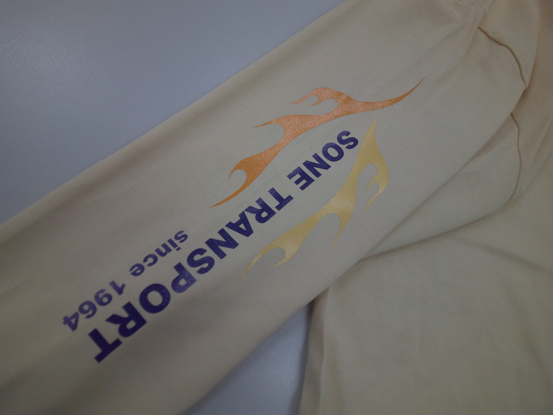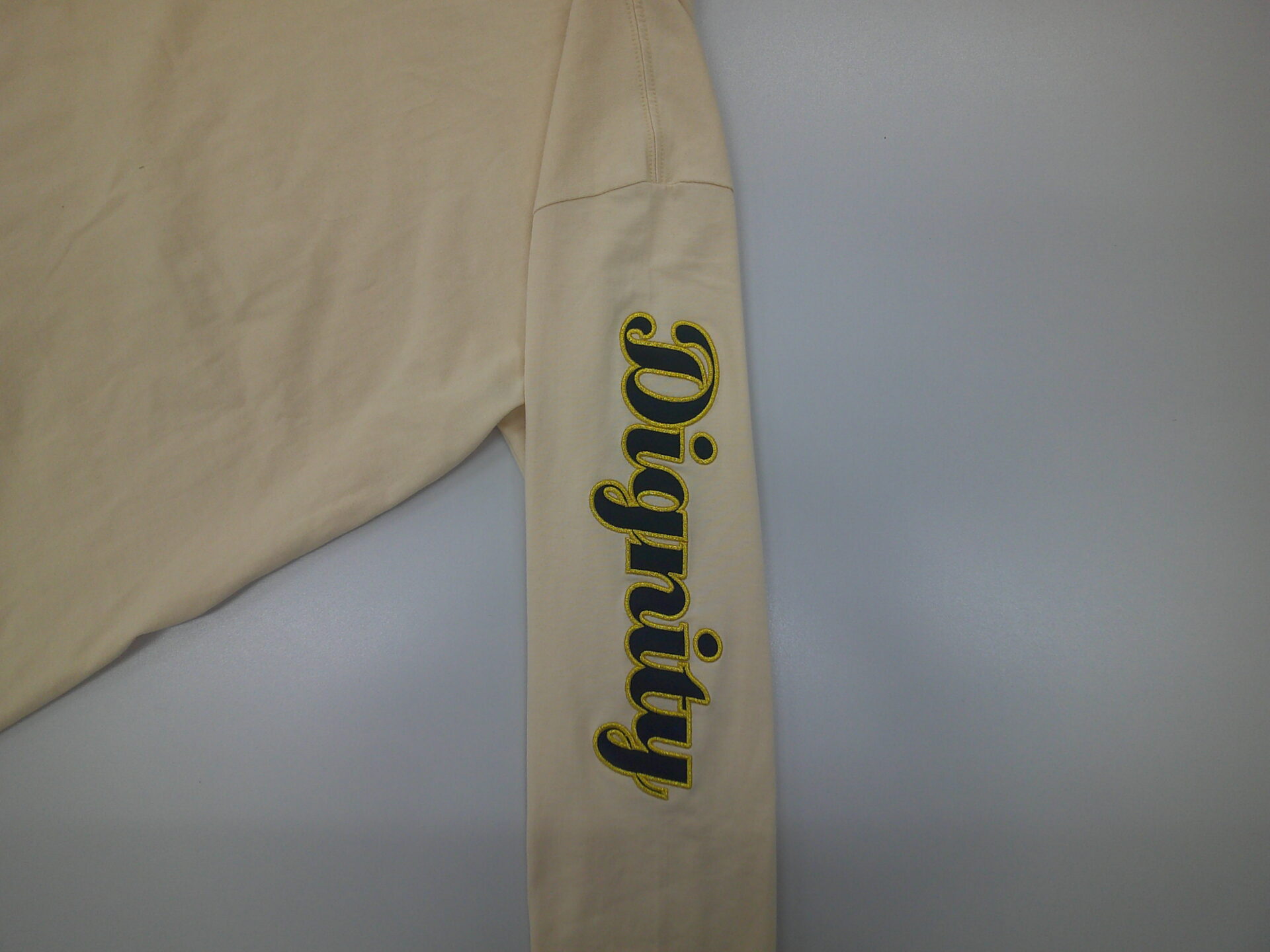 袖刺繍(ロングタイプ)に関して お知らせ 2026.01.06 サイズ制限はございますが、スウェットやアウターの袖にロングタイプの刺繍が制作できるようになりました刺繍加工が可能なサイズは「最大ヨコ寸:75mmまで」「最大タテ寸:280mmまで」となります 参考事例 <加工方法>縁取り刺繍<加工方法>直接刺繍 <加工方法>縁取り刺繍<加工方法>3D刺繍※ボリューム抑え目 <加工方法>ラバープリント<加工方法>直接刺繍 <加工方法>フルカラー転写プリント<加工方法>ラバープリント 袖加工は直接刺繍、縁取り刺繍、ラバープリント、フルカラー転写プリントの4種類の加工方法よりお選びいただけます刺繍はインパクトが強烈ですが、肌触り的にスウェットやアウター向きですTシャツの場合はラバープリントやフルカラー転写プリントが適していると思います