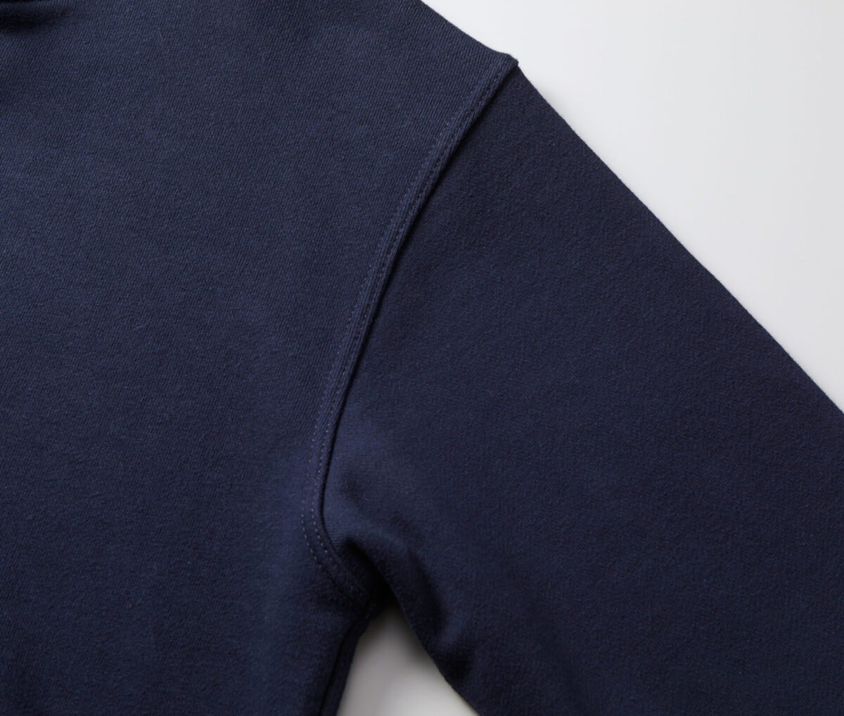 アームホールや袖口など、力が加わる部分のステッチワークは太番手の縫製糸と粗めの運針数でダブルステッチにすることで、堅牢さと立体感を実現しています